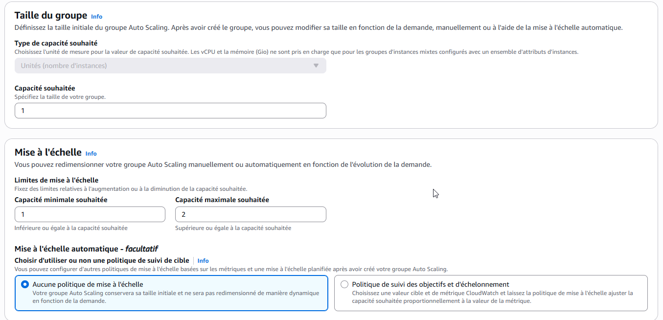 Maintenant, nous allons choisir la taille et les paramètres de notre Auto Scaling, il faut veiller à ne pas demander une trop grande capacité mal afin de limiter les coûts, tout en choisissant une qui assumera la charge que vous attendez de votre service.